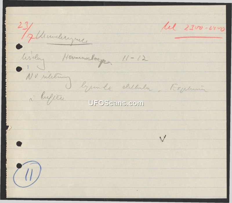 This document is a brief, handwritten log entry dated July 23rd. It records an event occurring between the hours of 2300 and 2400. The location mentioned is Hormankorpe. The text contains a reference to '11-12' and mentions 'NV' (likely an abbreviation for 'natvæsen' or similar, though not explicitly defined) in relation to an observation or report. The document is marked with the number 11 in a circle at the bottom left.