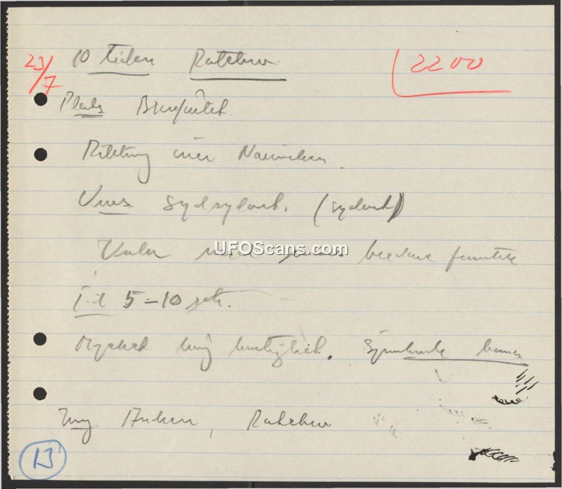 This document is a brief, handwritten field note documenting an aerial sighting that occurred on July 23rd at 2200 hours in the vicinity of Ratebu, Norway. The report indicates that between five and ten objects were observed moving at a very high speed. The trajectory of the objects is noted as coming from the south. The note is informal and lacks specific details regarding the physical characteristics of the objects, such as shape, color, or sound. The document serves as a primary record of a reported aerial phenomenon.