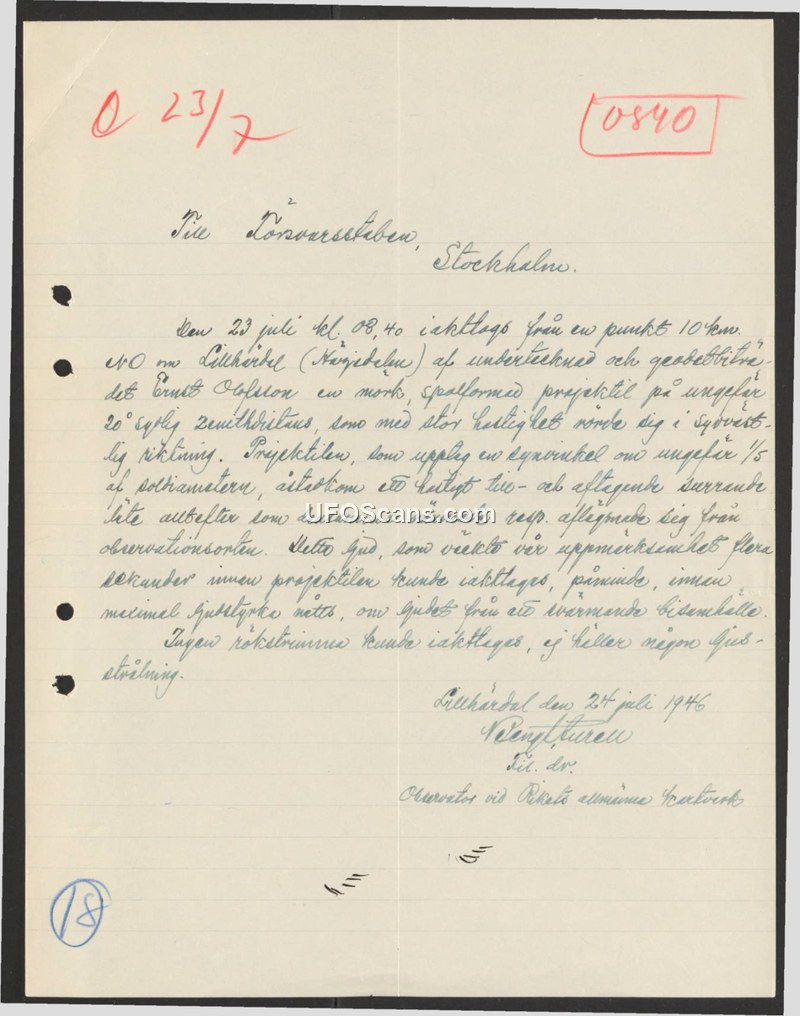 Sighting Report — Lillhärdal, Sweden, July 23, 1946