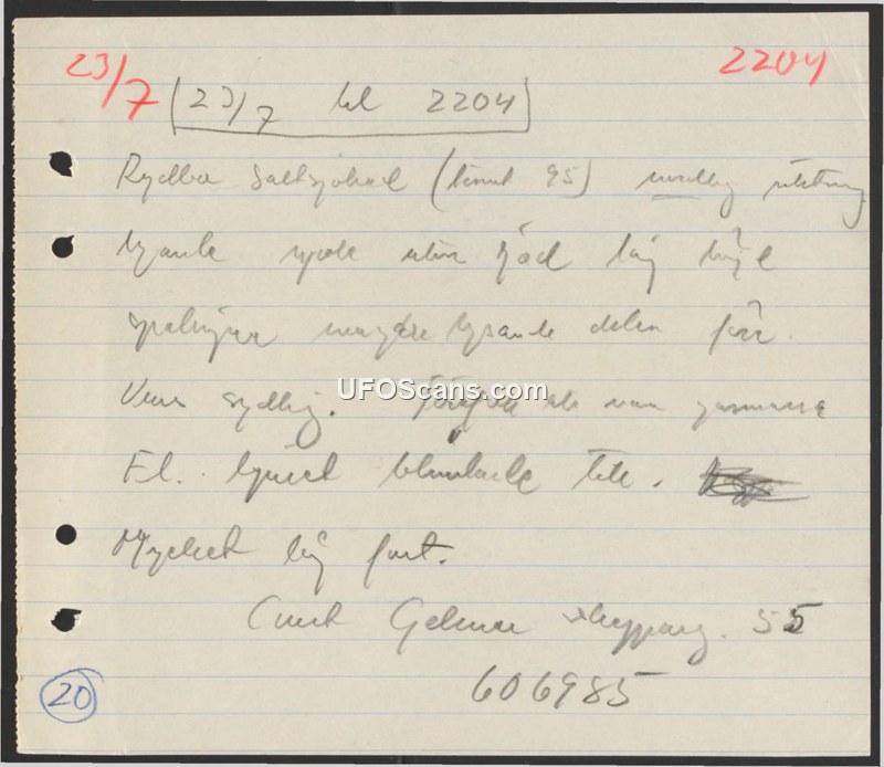 This document is a handwritten note recording a sighting that occurred on July 23, 1955, at 22:04 in Saltsjöbad, Sweden. The note describes a luminous object that was observed moving in a southerly direction. The object is described as moving fast. The document includes the reference number 606985 and the number 55, likely indicating the year 1955.