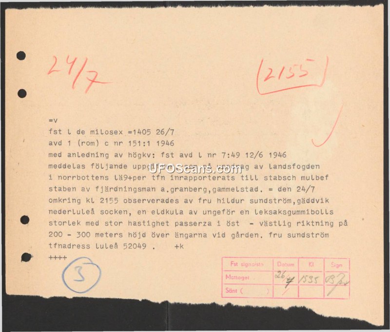 Sighting Report: Unidentified Aerial Object, Gäddvik, 24 July 1946