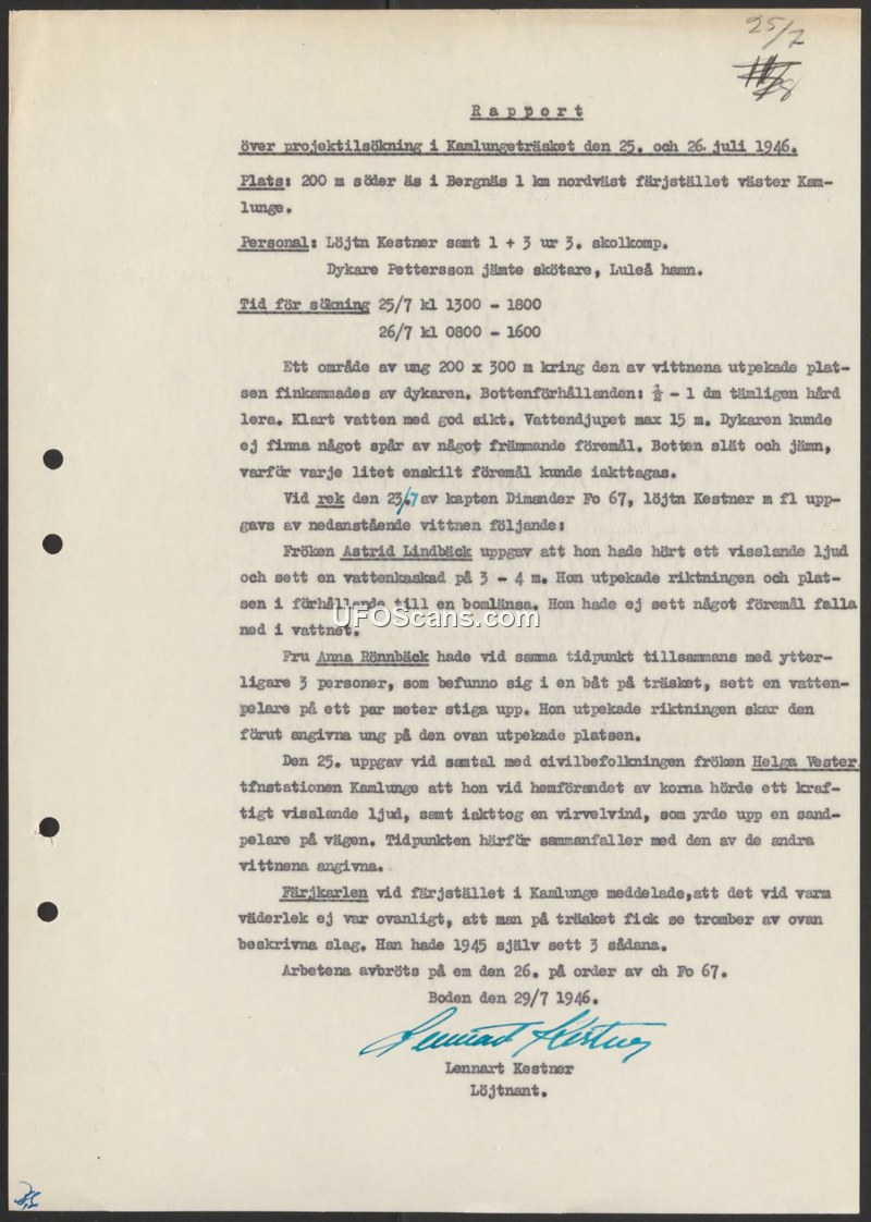 This report, dated July 29, 1946, details a military search operation conducted in Kamlungeträsket, Sweden, following reports of a potential projectile impact. The search, led by Lieutenant Lennart Kestner with a diver from Luleå harbor, took place on July 25 and 26, 1946. The team surveyed an area of approximately 200 by 300 meters. The diver reported that the lake bottom consisted of relatively hard clay, was smooth and even, and that visibility was good at a maximum depth of 15 meters. No foreign objects were discovered during the operation. The investigation included interviews with local witnesses. Astrid Lindbäck reported hearing a whistling sound and seeing a water cascade 3-4 meters high. Anna Rönnbäck, who was in a boat on the lake with three others, reported seeing a water column rise. Helga Vester, from the Kamlunge telephone station, reported hearing a loud whistling sound and observing a whirlwind that kicked up a pillar of sand on the road. The local ferryman at Kamlunge provided context, stating that during warm weather, it was not unusual to see whirlwinds (tromber) of the type described, noting that he had personally observed three such occurrences in 1945. The search was officially terminated on July 26, 1946, by order of the Chief of Fo 67.