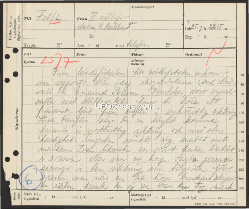 This document is a field report filed with the military staff regarding a sighting by two forest workers, Axel Nordvall and Emanuel Persson, in Vanhån. While the men were engaged in haymaking, they heard a rushing sound from the air. They observed an object moving in a southwesterly direction, which then changed course to a northeasterly direction at high speed. The object was described as descending rapidly toward the ground and was likened to a black ball with a tail. The witnesses attempted to run in the direction the object had traveled, but their view was obstructed by tall bushes, preventing them from seeing where it landed.