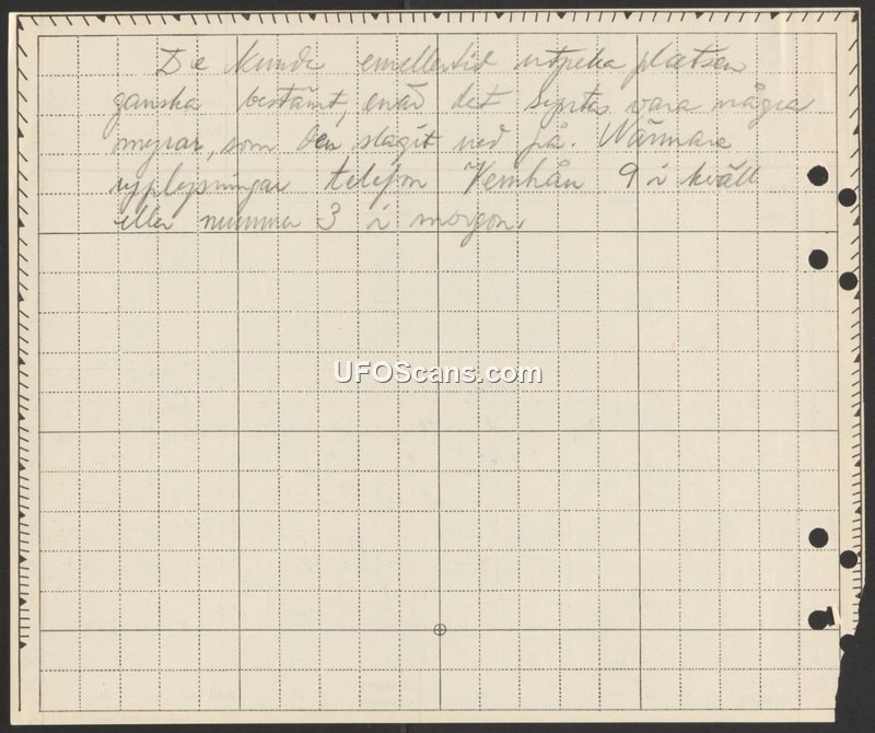 This handwritten document, written in Swedish, concerns the identification of a specific location where an object reportedly struck the ground. The author states that they were able to identify the site with a fair degree of certainty, noting the presence of marks at the impact point. The document concludes by requesting that further information be provided via telephone, specifically suggesting contact at 9:00 PM this evening or 3:00 AM tomorrow morning.