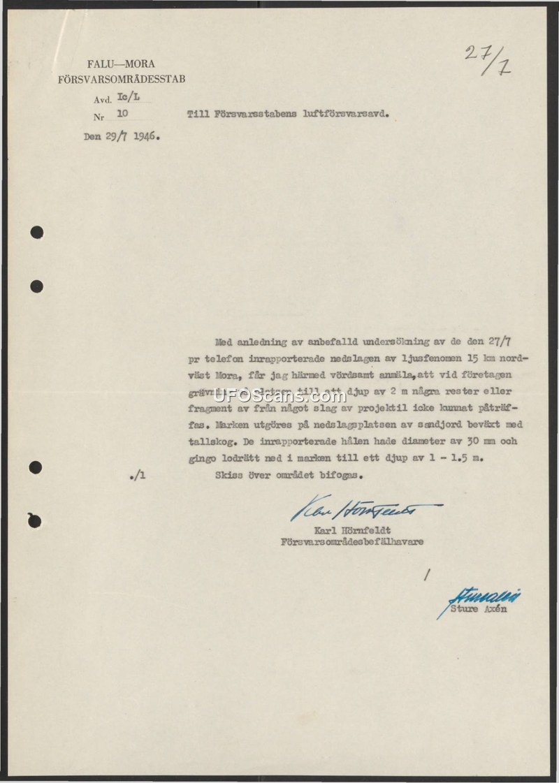 Med anledning av anbefalld undersökning av de den 27/7 pr telefon inrapporterade nedslagen av ljusfenomen 15 km nordväst Mora, får jag härmed vördsamt anmäla, att vid företagen grävning på platsen till ett djup av 2 m några rester eller fragment av från något slag av projektil icke kunnat påträffas.