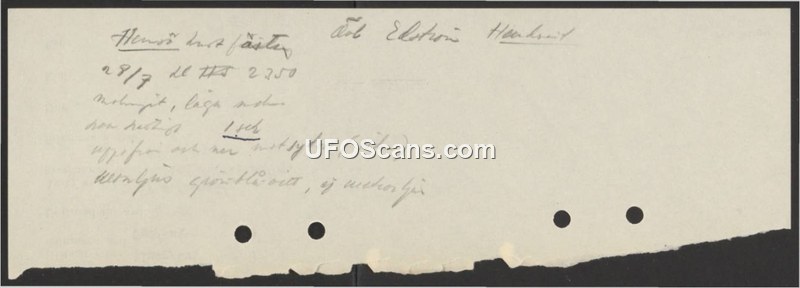 A handwritten report by Edström detailing a sighting of an object at Hensö on July 28th at 22:50. The object was observed moving vertically while traveling south with low noise.