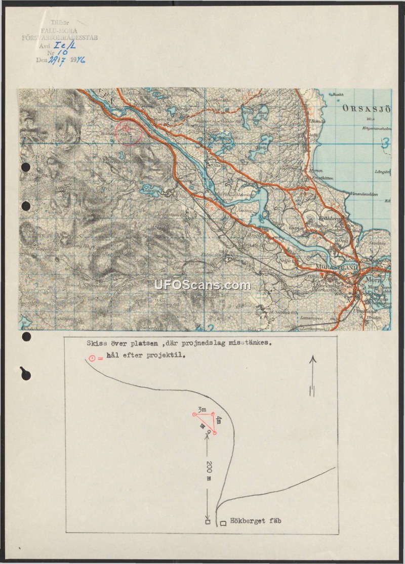 A 1976 Swedish military document identifying a site near Hökberget fäb where holes from a suspected projectile were located. It includes a topographical map and a site sketch.