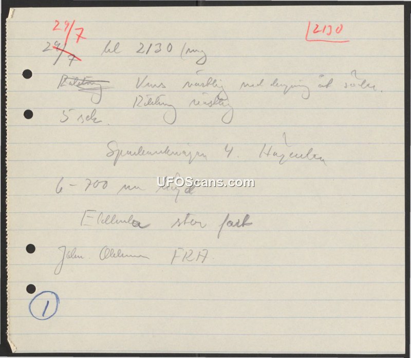 A brief handwritten record of an aerial sighting on July 29th at 21:30, involving an object moving at high speed at an altitude of 600-700 meters.