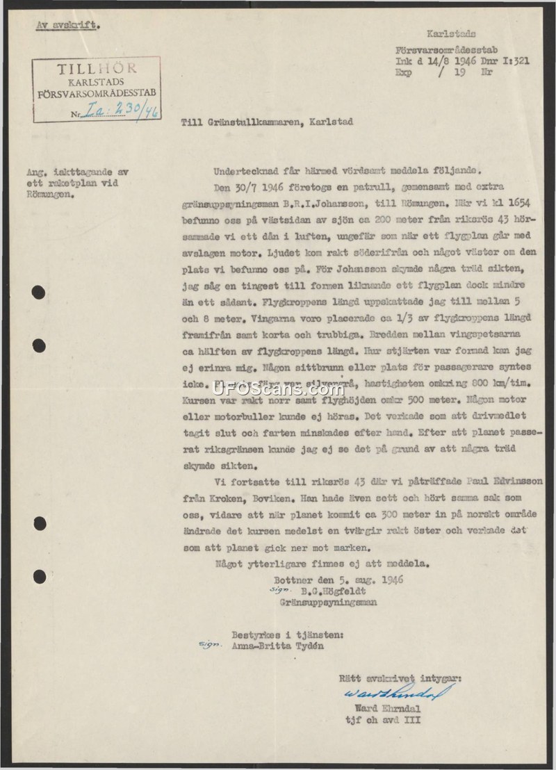 On July 30, 1946, at 16:54, a Swedish border patrol officer, B.R.I. Johansson, observed an unidentified aerial object while near Römningen, close to the border marker riksrös 43. The witness reported hearing a roar in the air, comparable to an airplane with its engine switched off. Upon looking, he saw an object that resembled an airplane but was smaller, with a length estimated between 5 and 8 meters. The object was silver-gray, had short, blunt wings with a span roughly half the length of its body, and lacked any visible cockpit or passenger area. The object was traveling north at an altitude of approximately 500 meters and a speed of about 800 km/h. No engine or motor noise was heard, and the witness noted that the object appeared to be losing speed as if its fuel had run out. The object was eventually obscured by trees after crossing the border. A second witness, Paul Edvinsson of Kroken, Boviken, confirmed seeing and hearing the same event. Edvinsson further observed that once the object had traveled approximately 300 meters into Norwegian territory, it executed a sharp turn to the east and appeared to descend toward the ground. This report was filed by B.G. Högfeldt on August 5, 1946, to the Border Customs Chamber in Karlstad.