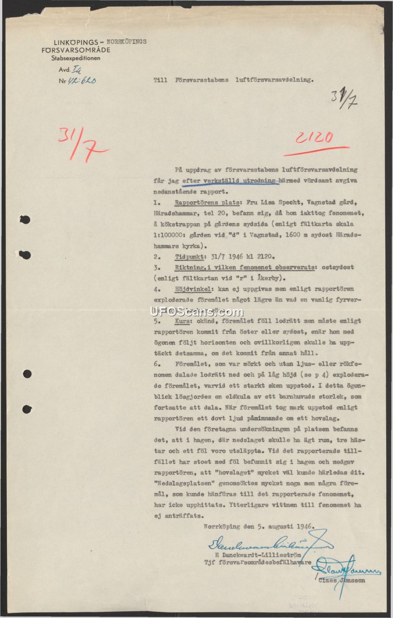 On August 5, 1946, E. Danckwardt-Lillieström, acting commander of the Linköping-Norrköping defense district, submitted a report regarding an aerial phenomenon observed on July 31, 1946, at 21:20. The primary witness, Fru Lisa Specht, observed the event from the kitchen stairs of the Vagnsstad farm in Häradshammar. According to the report, a dark object descended vertically at a low altitude. Upon reaching a low point, the object exploded, emitting a strong light. Following the explosion, a fireball approximately the size of a child's head was released and continued to descend. Upon reaching the ground, the object produced a dull sound described as being similar to a hoofbeat. The witness stated the object must have arrived from the east or southeast, as she had been watching the horizon and would have noticed it otherwise. An investigation of the pasture where the impact was alleged to have occurred revealed that three horses and a foal were present at the time. While the witness suggested the 'hoofbeat' sound could be attributed to the animals, a thorough search of the site failed to uncover any physical evidence or debris related to the phenomenon. No additional witnesses were identified.