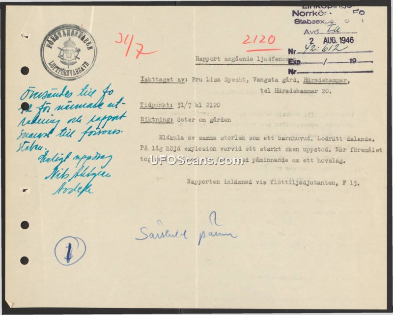 On July 31, 1946, at 21:20, Fru Lisa Specht observed an aerial phenomenon at Vangsta gård, Häradshammar, Sweden. The object was described as a fireball, approximately the size of a child's head, which descended vertically. Upon reaching a low altitude, the object exploded, producing a strong light. When the object reached the ground, it emitted a dull sound described as being reminiscent of a hoofbeat. The report was submitted to the Swedish military via the adjutant of the F 13 flotilla. A marginal note on the document, dated August 2, 1946, indicates that the report was forwarded to 'fo 2' for further investigation and reporting to the Defense Staff (Försvarsstaben).