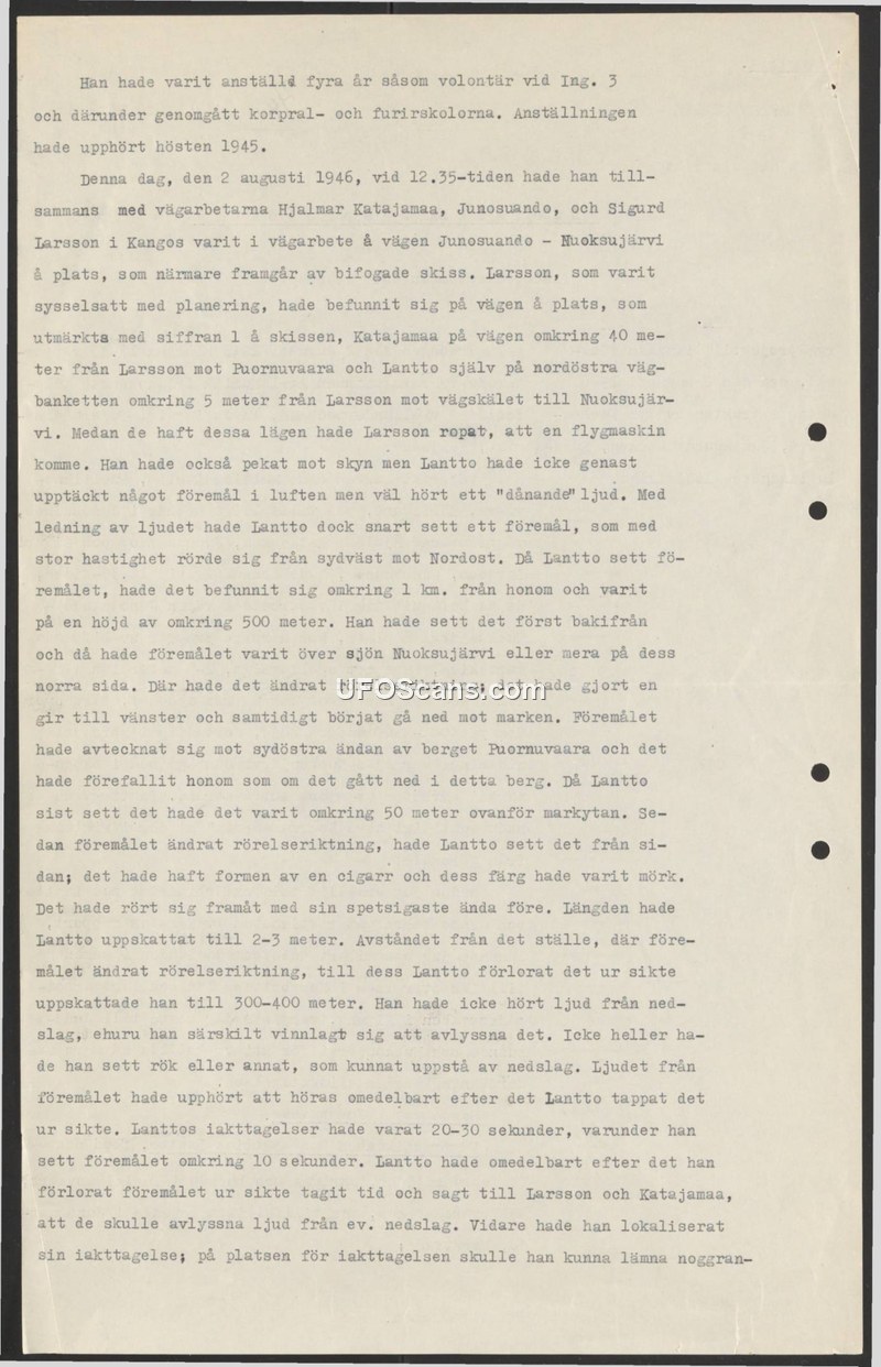 On August 2, 1946, at approximately 12:35, an individual identified as Lantto, a former volunteer at Ing. 3, was working on a road construction project between Junosuando and Nuoksujärvi alongside two other workers, Hjalmar Katajamaa and Sigurd Larsson. During the work, Larsson alerted the others to an approaching aircraft. While Lantto did not initially see an object, he heard a 'thundering' sound. Shortly thereafter, he observed an object moving at high speed from the southwest toward the northeast. The object was initially estimated to be one kilometer away at an altitude of approximately 500 meters. As it passed over or near the northern side of Lake Nuoksujärvi, the object banked to the left and began a descent toward the ground. Lantto observed the object against the backdrop of the southeastern end of Puornuvaara mountain, noting that it appeared to descend into the mountain. At the last moment of observation, the object was approximately 50 meters above the ground. Lantto described the object as dark and cigar-shaped, moving with its pointed end forward, and estimated its length to be two to three meters. The total duration of the observation was 20 to 30 seconds, with the object being in view for approximately 10 seconds. After losing sight of the object, the sound ceased immediately. Lantto reported no signs of impact, such as smoke or debris, despite specifically listening for such indicators. He immediately noted the time and instructed his colleagues to listen for any potential impact sounds.
