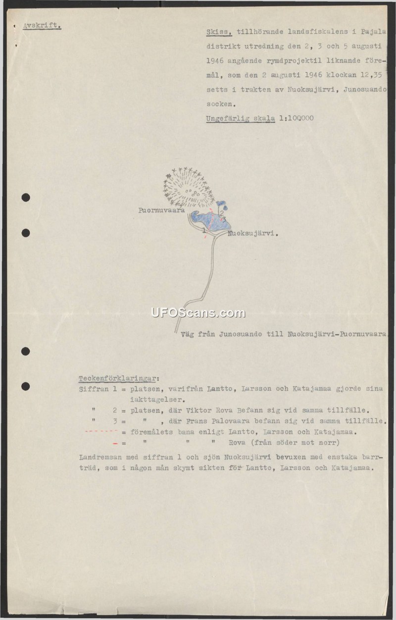 A 1946 Swedish district prosecutor's report detailing witness locations and the flight path of a 'space projectile-like object' seen near Nuoksujärvi. The document includes a sketch mapping the positions of five witnesses relative to the object's trajectory.