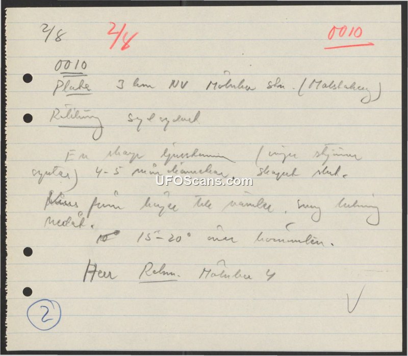 A handwritten report describes a 4-5 meter luminous object sighted 3km northwest of Molube, Norway, moving from right to left at 15-20 degrees elevation.