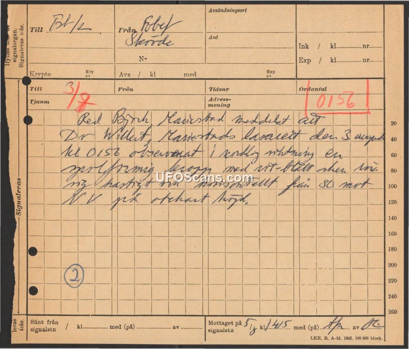A report from August 1945 detailing a sighting of a red-blue, cigar-shaped object by a doctor at Mariestad hospital in Sweden.