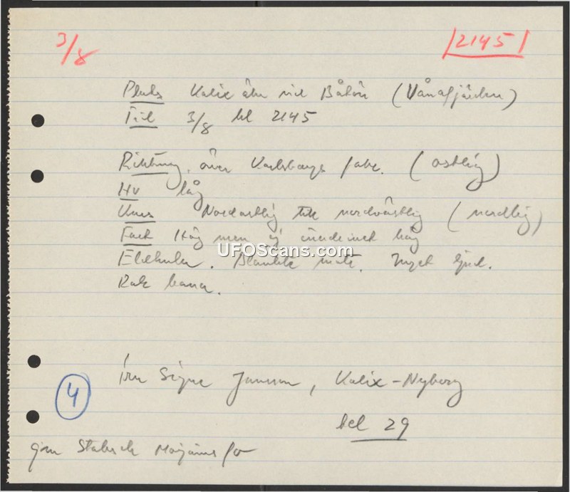 A handwritten report of a low-altitude, shiny, yellow object observed by Signe Junum in Kalix, Sweden, on August 3, 1945.