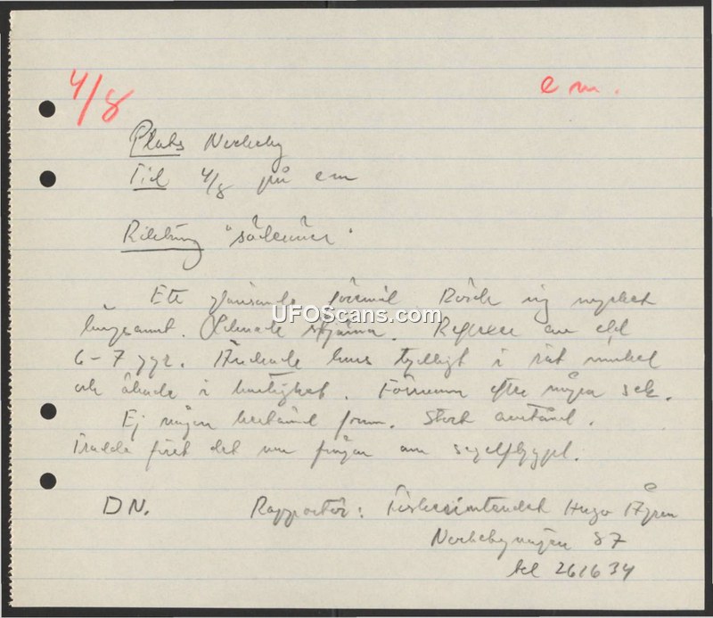 This handwritten document is a sighting report from Norrby, Sweden, dated August 4th. The reporter, Hugo [illegible], describes observing a single object moving very slowly in a straight line at a constant speed. The object was estimated to be at an altitude of 6-7 kilometers. The report notes that the object had no recognizable shape and disappeared after a few seconds. The document includes the reporter's address at Norrbyvägen 87 and a telephone number, 261634.