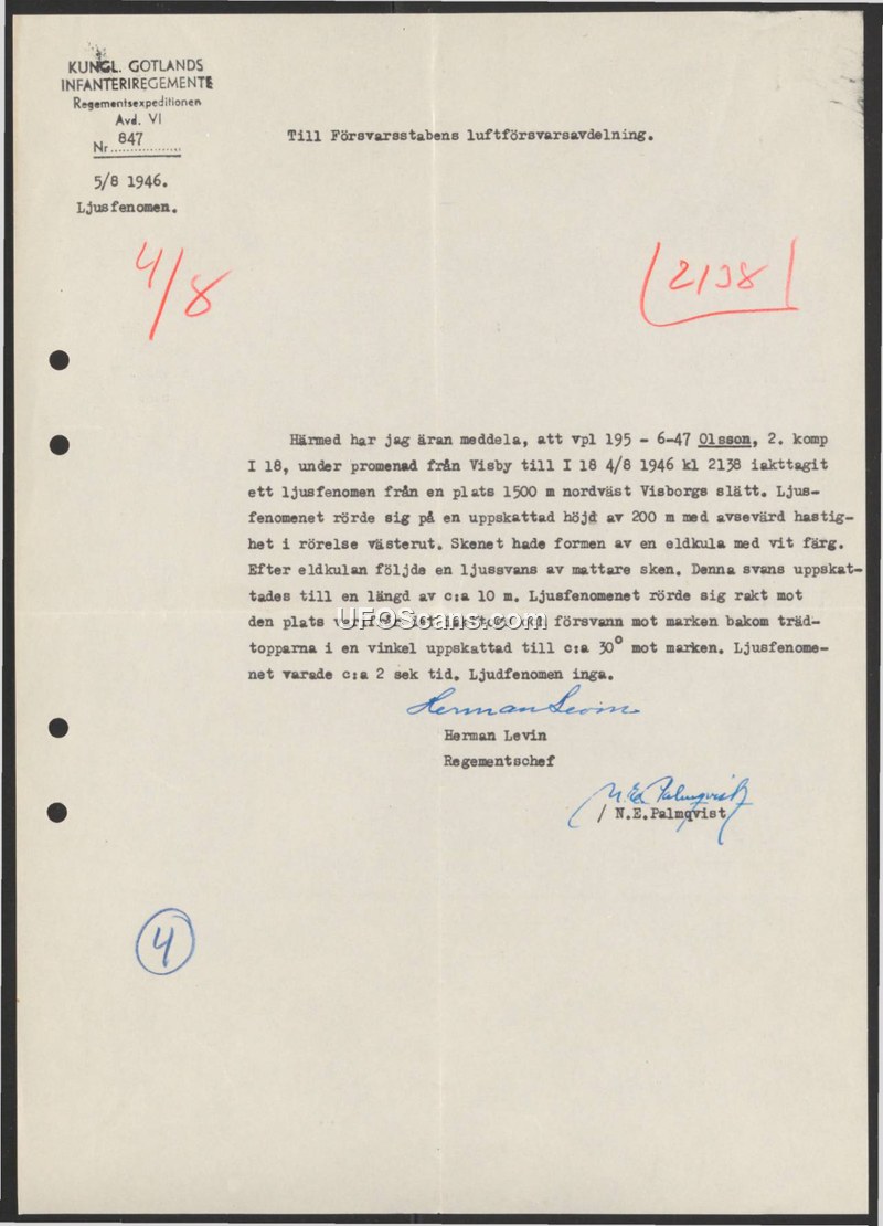 On August 5, 1946, the Royal Gotland Infantry Regiment (Kungl. Gotlands Infanteriregemente) issued a report to the Air Defense Department of the Defense Staff regarding a sighting of an unidentified light phenomenon. The report details an incident that occurred on August 4, 1946, at 21:38. The witness, a soldier identified as Olsson (vpl 195-6-47) of the 2nd Company, I 18, observed the phenomenon while walking from Visby to I 18. The sighting took place at a location 1500 meters northwest of Visborgs slätt. According to the report, the object appeared as a white fireball moving westward at an estimated altitude of 200 meters with considerable speed. The fireball was followed by a tail of a duller glow, estimated to be approximately 10 meters in length. The object moved directly toward the observer's location before disappearing toward the ground behind treetops at an angle estimated at 30 degrees relative to the ground. The entire event lasted approximately two seconds, and no sound was associated with the phenomenon. The document is signed by the Regimental Commander, Herman Levin.