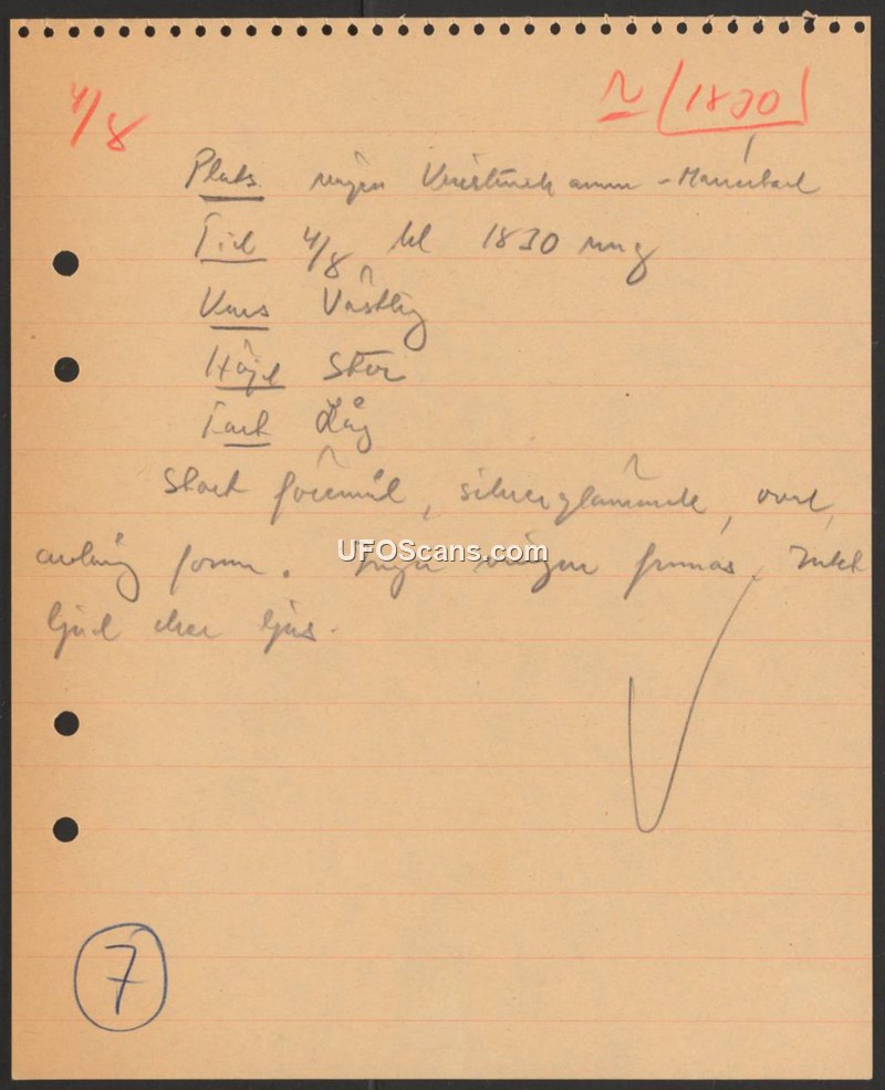 A handwritten report from August 4th at 18:30 hours describing a silver, oval-shaped object without wings or lights.