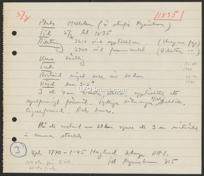 A handwritten Swedish sighting report from August 5th describing a cigar-shaped object observed near Mellsten. The object was estimated to be 3 meters in size at a distance of 20 kilometers.