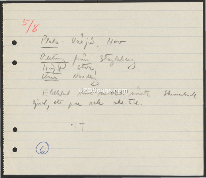 This document is a brief, handwritten note documenting an aerial sighting in Vaxjo, Hov, Sweden. The text indicates the location as Vaxjo, Hov, and notes the direction of the sighting as from Skaglaberg. The object is described as large and yellow. The note also mentions a movement described as 'northerly'. The document is sparse and appears to be a field observation record.