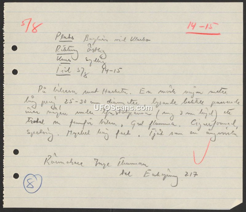 A report of a cigar-shaped object observed near Klarbo, Sweden, by witness Inge Thuman. The object was described as having a yellow flame and sounding like a steam engine.