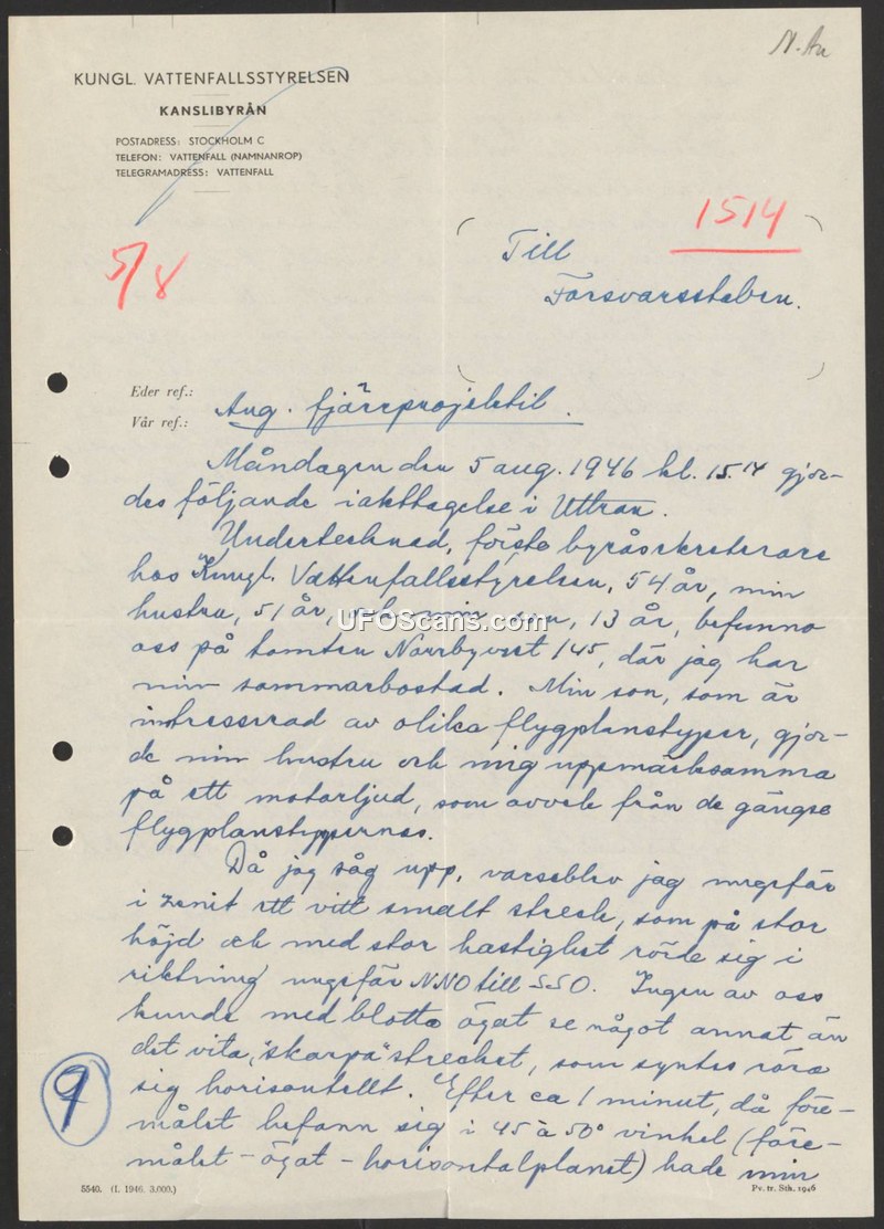 Sighting Report - Utran, Sweden, August 5, 1946
