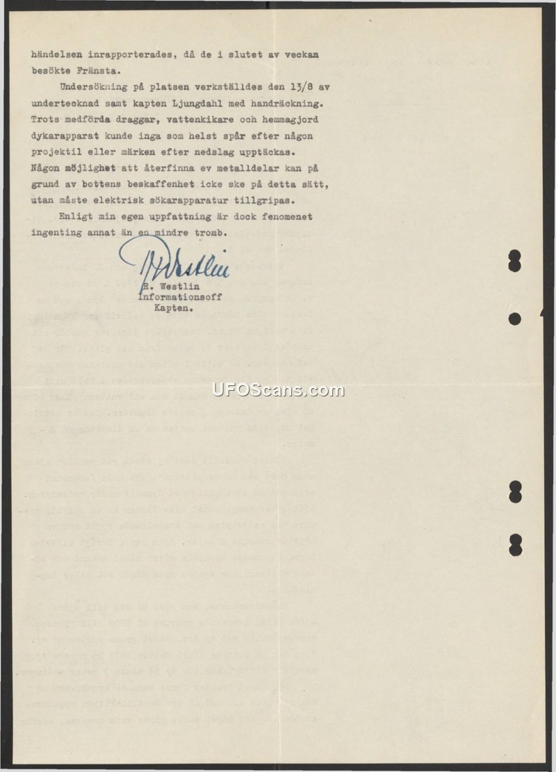 This document is a field report authored by Captain R. Westlin regarding an investigation into an incident that occurred in Fränsta. The incident was reported when individuals visited Fränsta at the end of the week. On August 13th, Captain Westlin and Captain Ljungdahl conducted an on-site investigation. Despite utilizing equipment such as drags, water viewers, and a homemade diving apparatus, the investigators were unable to locate any traces of a projectile or any evidence of an impact. The report notes that the condition of the lake bottom prevented the recovery of any potential metal fragments using the available tools, suggesting that specialized electrical search equipment would be necessary for such a task. Ultimately, Captain Westlin concludes that the phenomenon was likely nothing more than a small whirlwind (tromb).