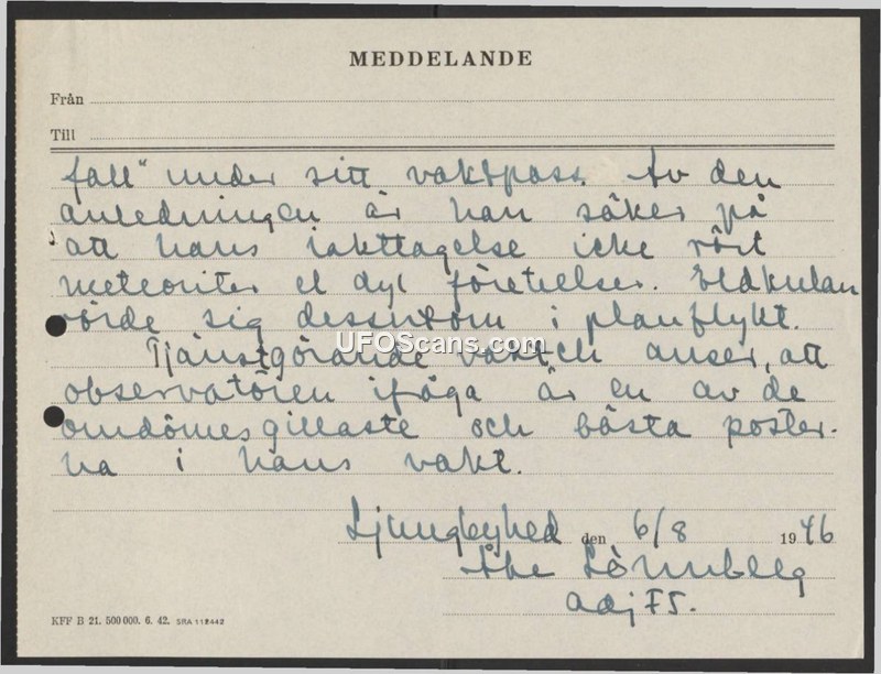 A 1946 Swedish military report documenting a reliable observer's sighting of an object in level flight, explicitly ruling out meteorites.