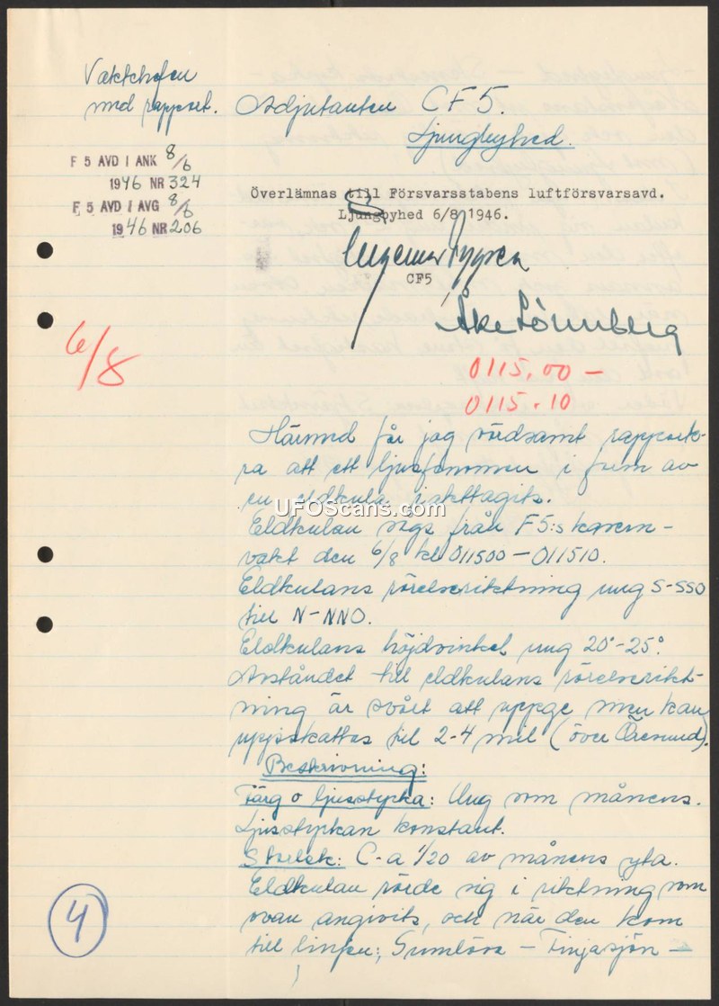 A report from the Swedish F 5 Wing detailing the observation of a fireball on August 6, 1946. The object was observed for approximately 10 seconds moving towards the N-NNO.