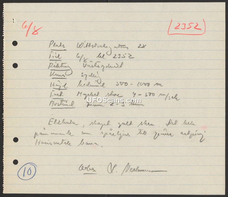 A handwritten report of a yellow, shining aerial object observed on August 6 at 23:52 near Wittstock/Dosse. The object moved horizontally at an altitude of 500-1000 meters for 2-3 minutes.