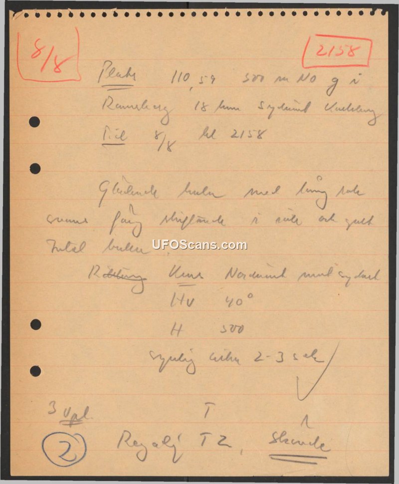 This handwritten field report documents a sighting that occurred on August 8 at 21:58 in the vicinity of Ramberg. The observer reported a glowing object, described as a ball, which exhibited a color shift between red and yellow. The object was observed moving from the north to the south. The duration of the sighting was estimated to be between two and three seconds. The document contains brief notations regarding the observation, including an altitude or angle reference of 40 degrees and a reference to a 'Regal TZ'.