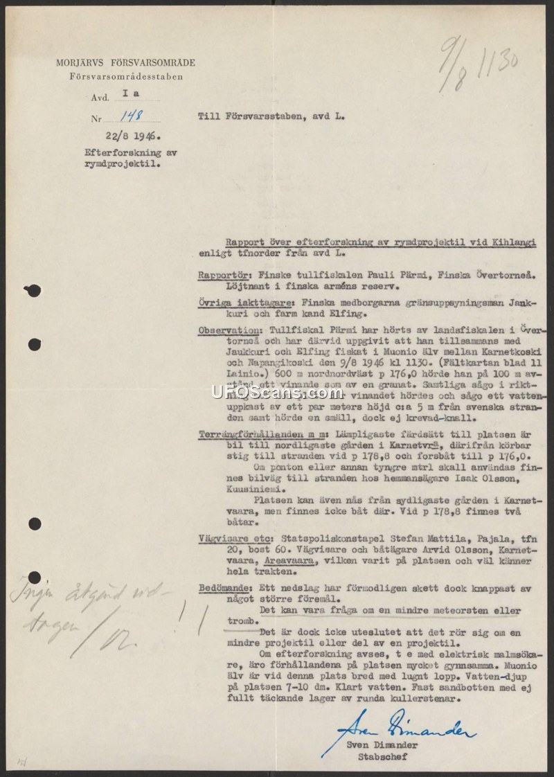 This report, dated August 22, 1946, from the Morjärv Defense District, details an investigation into a potential 'space projectile' sighting. On August 9, 1946, at 11:30, three Finnish citizens—Pauli Parini (a customs official and reserve lieutenant), a border guard named Jauk kuri, and a candidate named Elfing—were fishing in the Muonio River between Karnetkoski and Hapangikoski. While at a location 600 meters north-northwest of point 176.0, they heard a whining sound, described as similar to a shell, from a distance of 100 meters. They observed a water splash approximately two meters high about five meters from the Swedish shore, followed by a thud, though not an explosion. The report provides logistical details for reaching the site, including the use of local guides like Arvid Olsson. The author, Stabschef Sven Dimander, concludes that while an impact likely occurred, it was not caused by a large object. He suggests the phenomenon could be a small meteorite, a whirlwind, or a small projectile. He notes that the site is highly suitable for a search using an electric metal detector, as the river is shallow (7-10 decimeters), clear, and has a firm sand bottom.