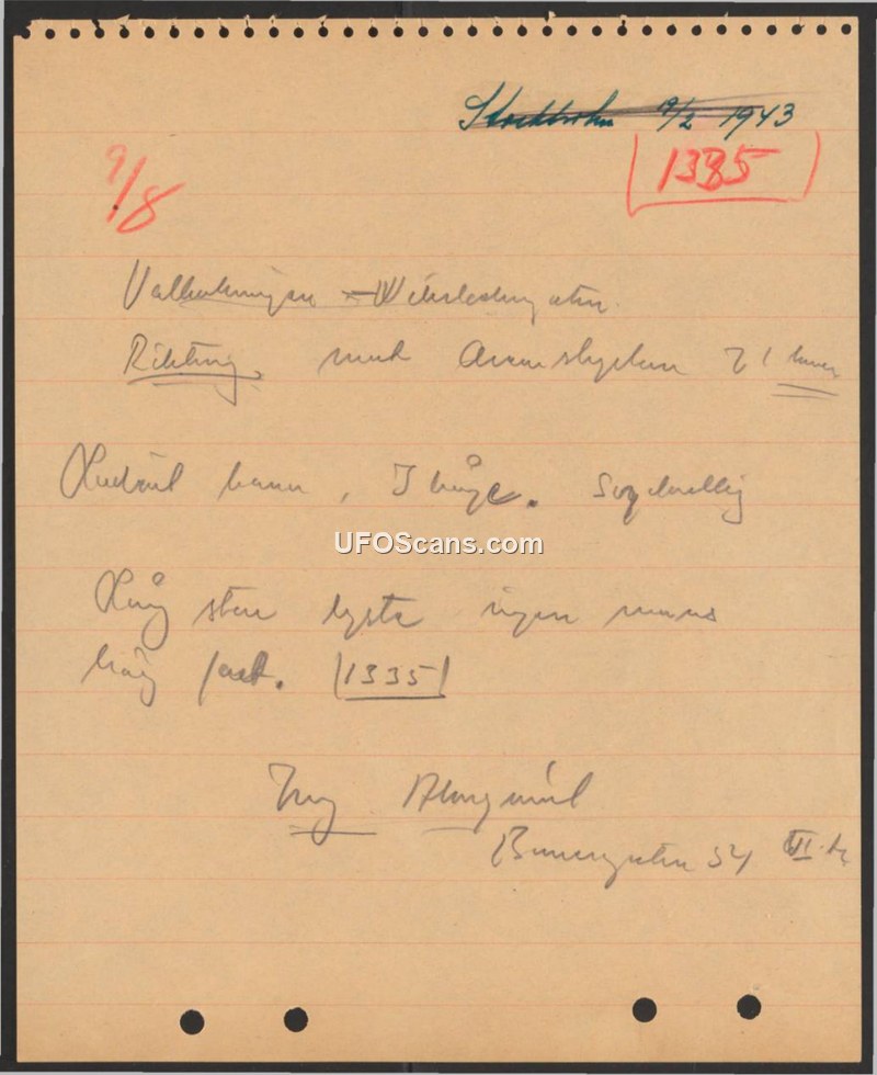 This document is a brief, handwritten field report dated September 8, 1943, originating from Stockholm. The report notes a sighting occurring at 1335 hours. The text contains limited descriptive information, mentioning a direction and a reference to an object or event. Due to the handwritten nature and the brevity of the notes, the specific details regarding the nature of the object or the circumstances of the sighting remain largely ambiguous.