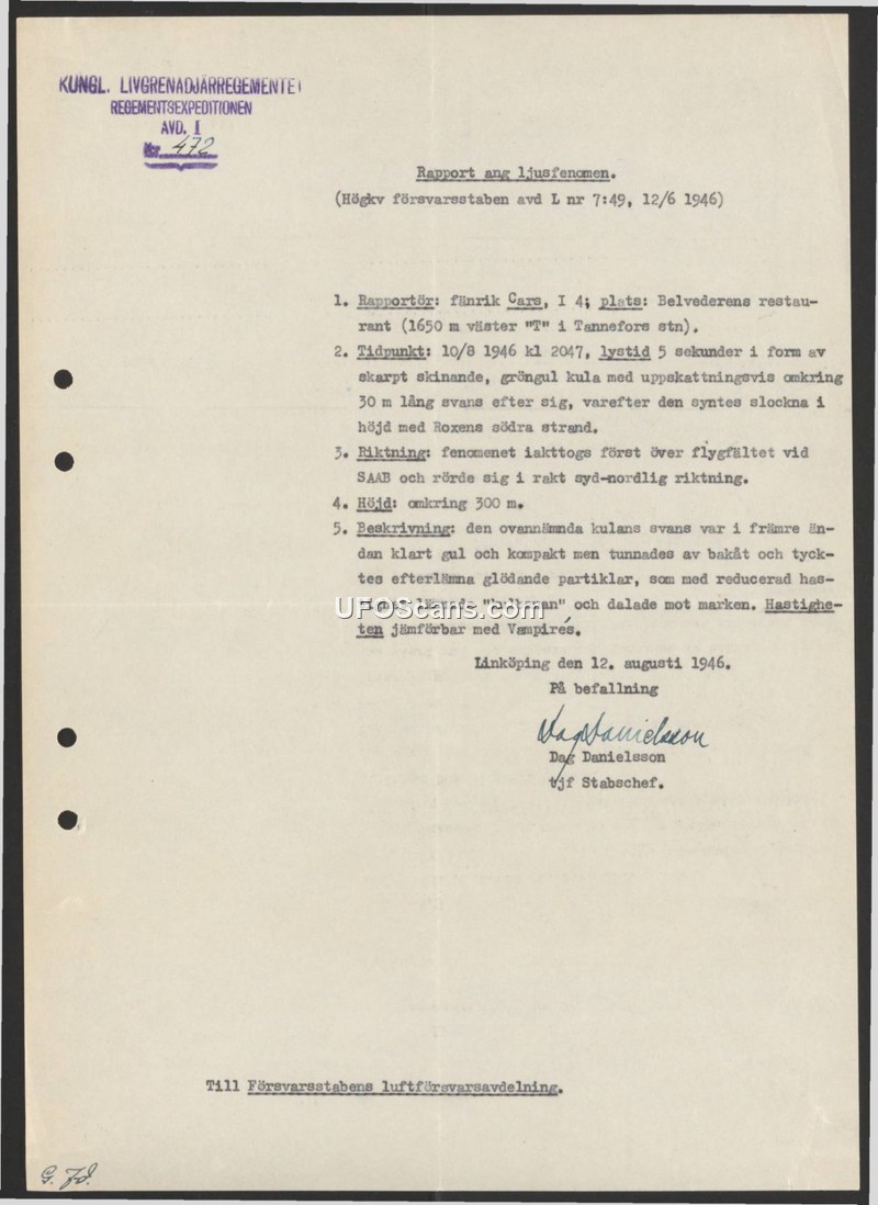 Rapport ang ljusfenomen (Report regarding light phenomenon) — Linköping, August 12, 1946