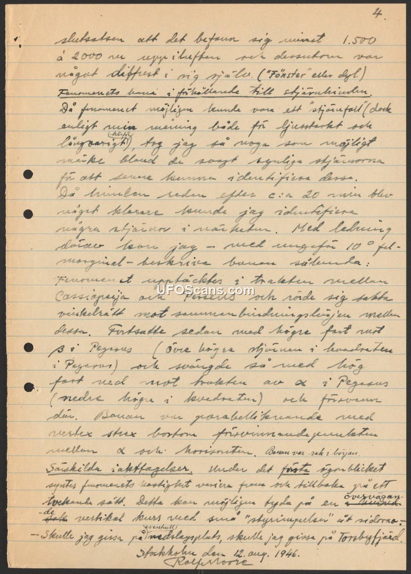 This document is a personal account written by Rolfe Moore on August 12, 1946, detailing an aerial sighting. The witness estimates the object was at an altitude of 1500 to 2000 meters. Moore describes the object's movement in relation to stars, noting it was first observed between Cassiopeia and Perseus. The object moved slowly before accelerating toward Beta Pegasi and eventually disappearing near Alpha Pegasi. The witness describes the trajectory as parabolic. Notably, Moore reports that the object appeared to vary its speed and exhibited 'steering impulses' to the sides, suggesting controlled flight. The witness also mentions a possible 'window' or similar feature on the object. The report concludes with the witness's speculation that the object may have landed at Torsbyfjärd.