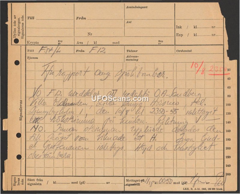 The object was observed by editor O.A. Sandberg at 23:50-23:55 on August 10, 1945. The object appeared to split into something resembling an 'H' before the crash/descent ended. Altitude and speed could not be determined.