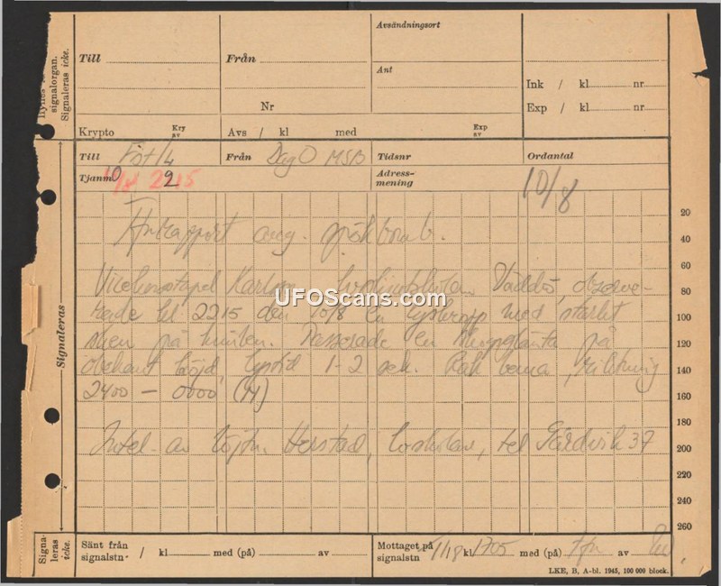 A field report from August 10, 1948, documenting a sighting of a green fireball by a caretaker named Karlsson. The report was filed by Captain Herstad.