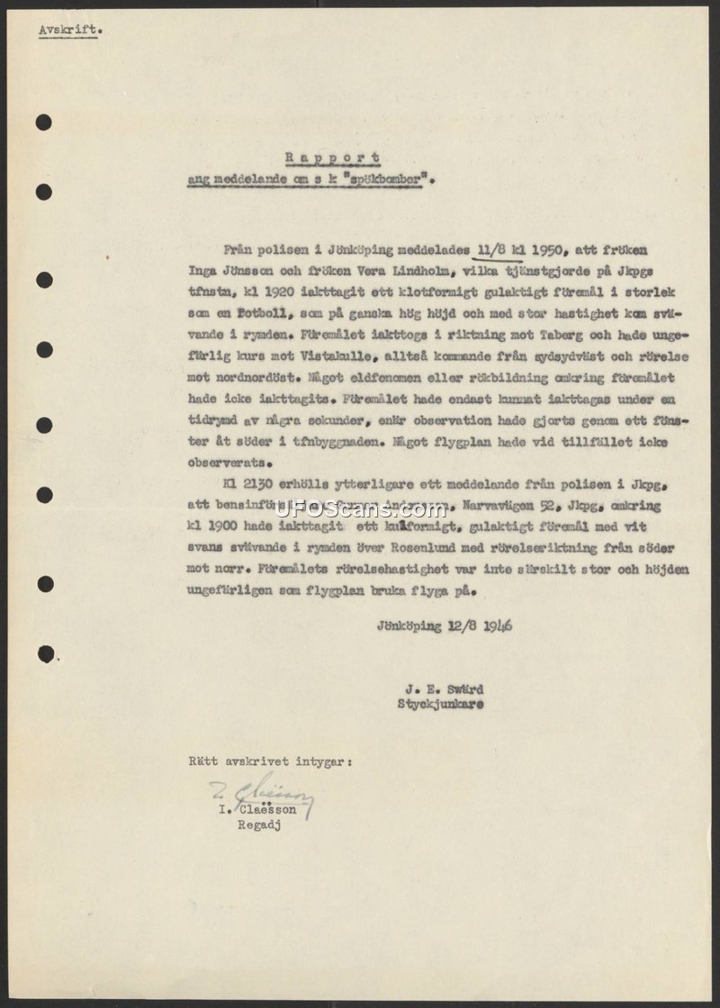 This report, dated August 12, 1946, and signed by Styckjunkare J. E. Swärd, documents two separate sightings of unidentified aerial phenomena in Jönköping, Sweden, occurring on August 11, 1946. The first incident took place at 19:20, when two employees at the Jönköping telephone station, Inga Jönsson and Vera Lindholm, observed a yellowish, ball-shaped object the size of a football. The object was seen at a high altitude, moving at high speed from the south-southwest toward the north-northeast in the direction of Taberg and Vistakulle. The witnesses observed the object for only a few seconds through a south-facing window. No fire or smoke was noted, and no aircraft were observed in the vicinity at the time. A second report was received at 21:30 regarding a sighting at approximately 19:00 by a gas station attendant named Gunnar Andersson, located at Narvavägen 52. Andersson reported seeing a yellowish, ball-shaped object with a white tail floating over the Rosenlund area. He noted that the object moved from south to north, that its speed was not particularly high, and that its altitude was comparable to that of typical aircraft. The document is certified as a true copy by I. Claesson, Regadj.