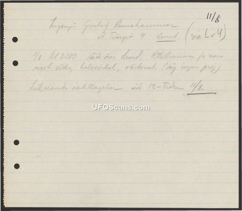 A sighting was reported by Engineer Gustaf Rumshammar on August 11 at 2200 hours over Lund. The object was described as a semicircle with a smoke trail moving from north to south. Similar observations were noted around the same time on August 11.