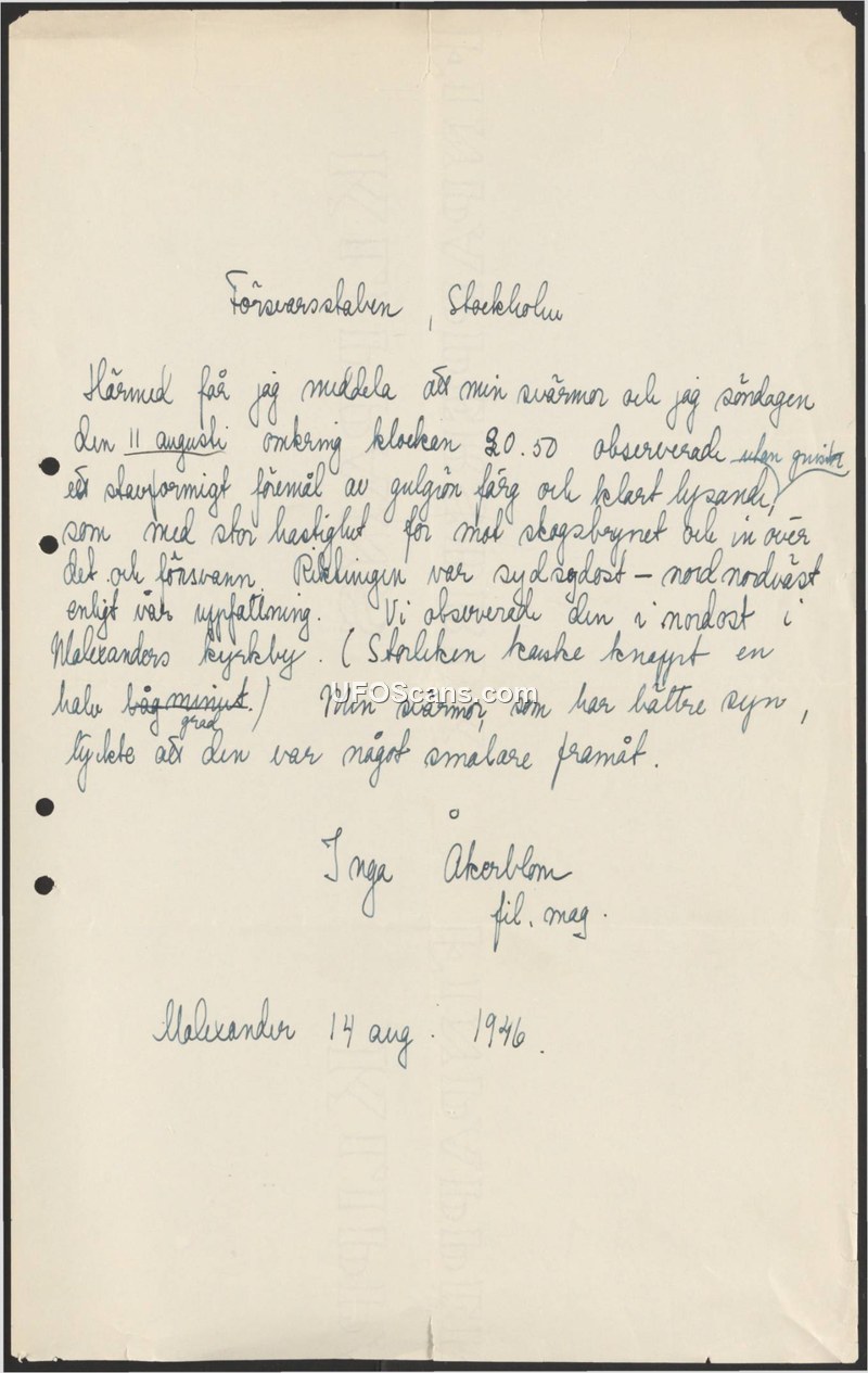 On August 14, 1946, Inga Akerblom, a fil. mag. (Master of Philosophy), submitted a report to the Swedish Defence Staff (Försvarsstaben) in Stockholm regarding an aerial sighting. She states that on Sunday, August 11, 1946, at approximately 20:50, she and her mother-in-law observed a rod-shaped object. The object was described as yellow-green in color and clearly luminous. According to the report, the object moved at a high rate of speed from the southeast toward the northwest, traveling toward and over the forest edge before disappearing. The observers were located in the village of Malexander. Akerblom noted that the object's size appeared to be just under half a degree. She further remarked that her mother-in-law, who possessed better eyesight, observed that the object appeared somewhat narrower at the front.