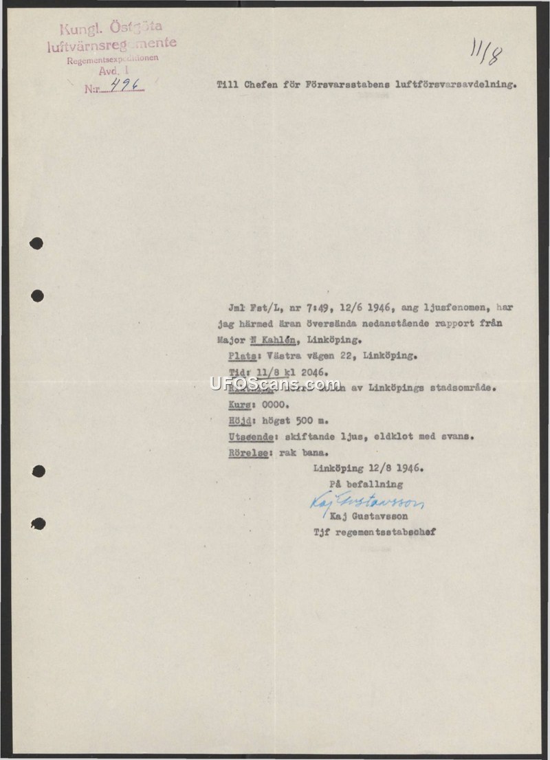 A 1946 Swedish military report detailing a sighting of a 'fireball with a tail' over Linköping. The report was filed by Major N. Kahlén and forwarded to the Defense Staff.