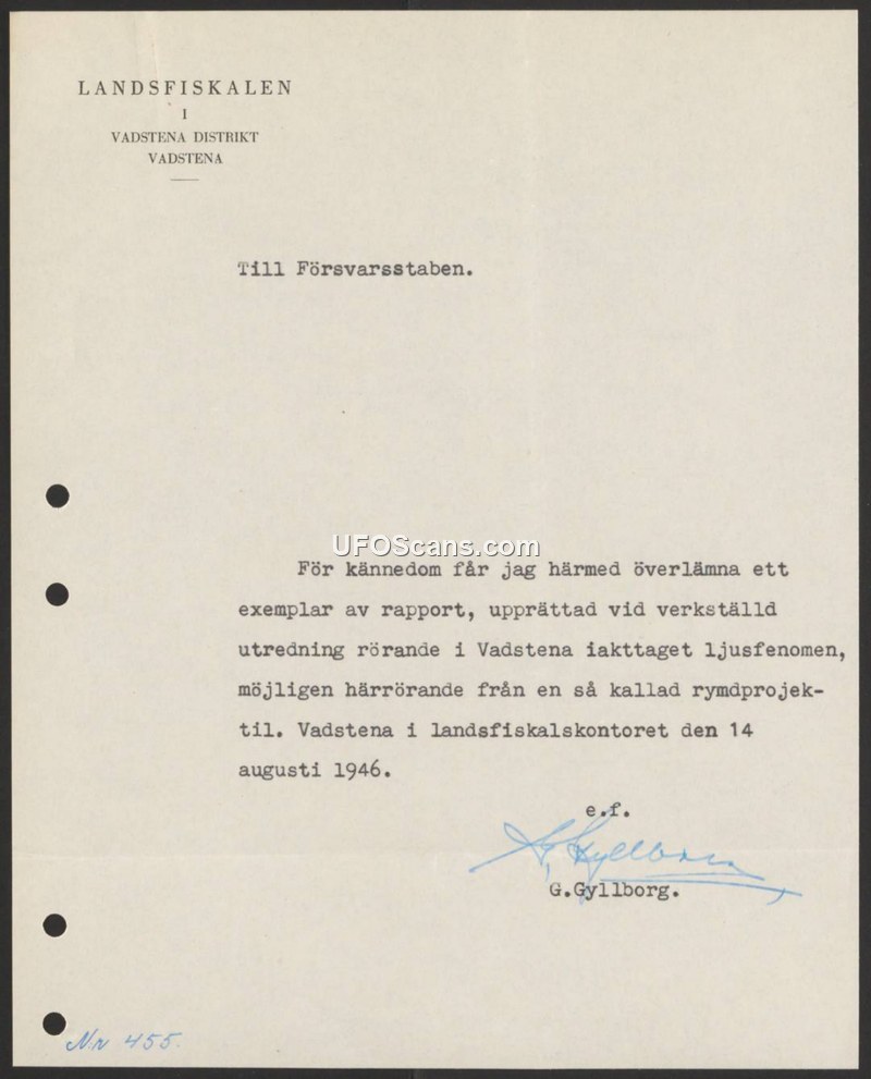 This document is a formal letter dated August 14, 1946, sent by G. Gyllborg, the Landsfiskal (District Police Commissioner) of the Vadstena district, to the Swedish Defence Staff (Försvarsstaben). The purpose of the correspondence is to transmit a copy of a report concerning a light phenomenon observed in Vadstena. The author notes that the phenomenon might possibly originate from what is referred to as a 'space project' (rymdprojekt). The document serves as a transmittal note for the enclosed investigation report.