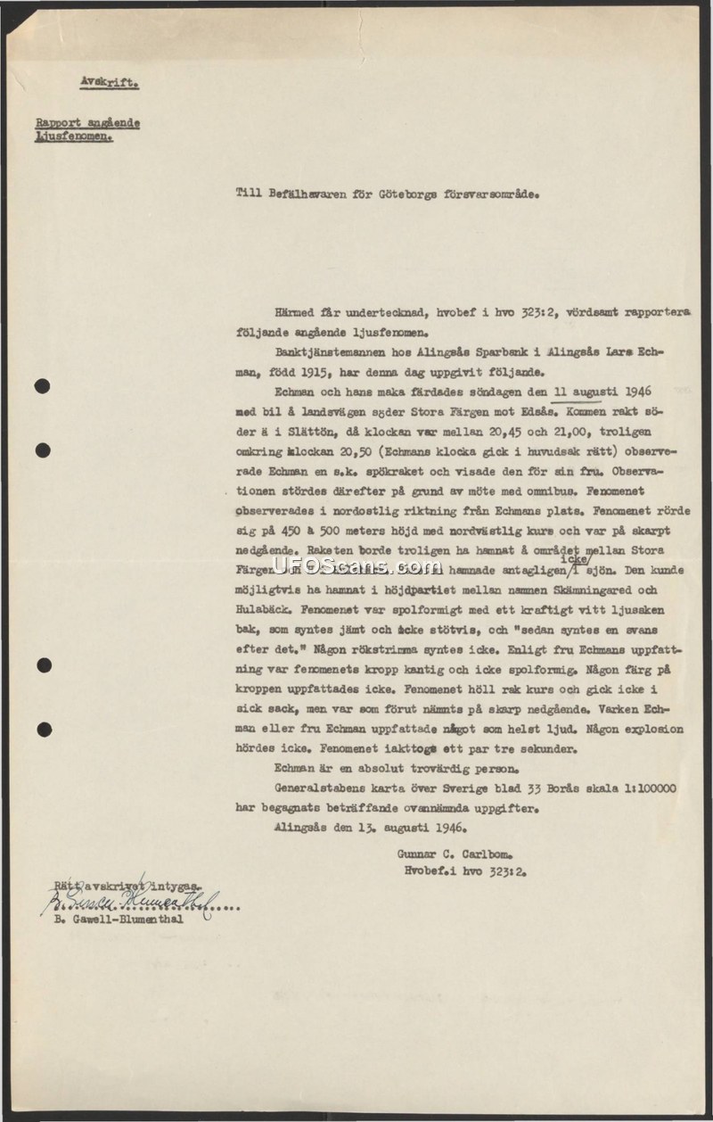 This report, dated August 13, 1946, is an official account submitted to the Commander of the Gothenburg Defense District regarding a 'ghost rocket' sighting. The primary witness, Lars Echman, a bank official at Alingsås Sparbank, reported that while driving with his wife on the evening of August 11, 1946, between 20:45 and 21:00, he observed an aerial phenomenon. The object was seen in a northeasterly direction, moving at an altitude of 450 to 500 meters on a northwesterly course. The witness described the object as spindle-shaped with a powerful white light at the rear, which appeared to emit a tail. While the witness described the object as spindle-shaped, his wife perceived the body as angular. The object maintained a straight course without zig-zagging but was in a sharp descent. The observation lasted approximately three seconds. Neither witness heard any sound or explosion. The report notes that the object likely landed in the area between Stora Färgen and Hulabäck, possibly in the lake. The author of the report, Gunnar C. Carlbom, explicitly states that the witness is an absolutely credible person and mentions that the General Staff's map of Sweden (Borås sheet, scale 1:100,000) was used to verify the location details.