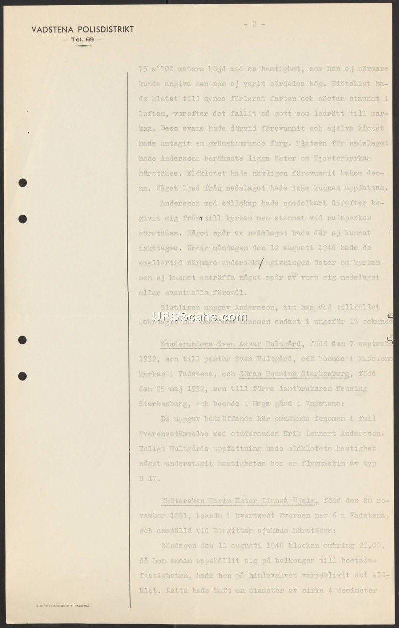 This document is a report from the Vadstena Police District regarding a sighting of an unidentified aerial phenomenon on August 11, 1946. Several witnesses, including students Erik Lennart Andersson, Sven Assar Hultgård, and Göran Henning Starkenberg, as well as a nurse named Karin Ester Linnea Hjelm, reported seeing a fireball in the sky. The object was described as having a diameter of approximately 4 decimeters and a green-shimmering color. According to the accounts, the object was observed at an altitude of 75 to 100 meters. It appeared to lose speed, stop in the air, and then fall vertically to the ground behind the local monastery church. The witnesses reported that the object's tail disappeared during this maneuver. No sound was heard during the descent. Despite an immediate search by the witnesses and a follow-up investigation on August 12, 1946, no physical traces or objects were found at the site. The witnesses estimated the speed of the object to be slightly less than that of a B 17 aircraft. The observation lasted approximately 15 seconds.