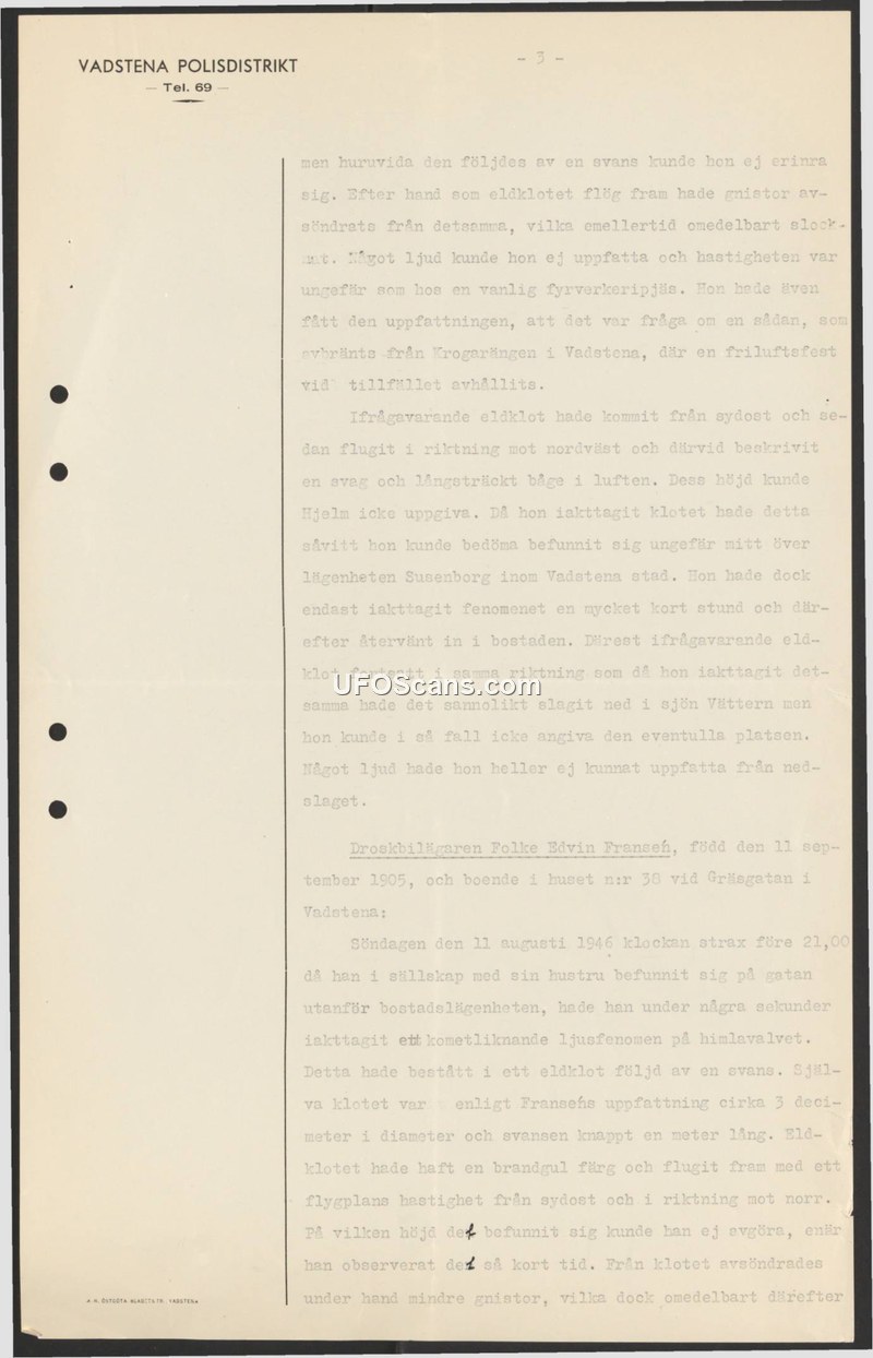 Vadstena Police District Sighting Report - August 11, 1946