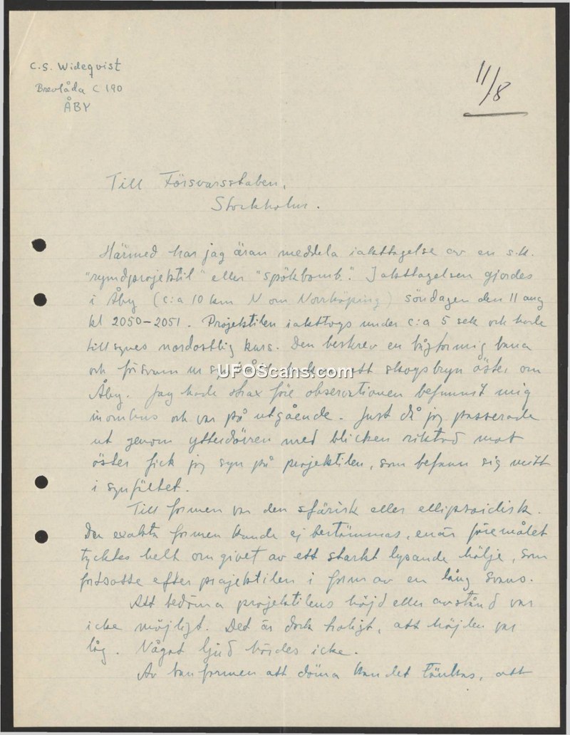 This document is a formal report submitted by C.S. Wideqvist to the Swedish Defence Staff (Försvarsstaben) in Stockholm. The author reports observing a 'ghost bomb' or 'space projectile' on Sunday, August 11, between 20:50 and 20:51. The sighting occurred in Åby, approximately 10 kilometers north of Norrköping. Wideqvist states that he was exiting his house when he observed the object moving in a northeasterly direction. The object was described as spherical or ellipsoidal in shape, surrounded by a brightly shining sheath, and followed by a long tail. The observation lasted for approximately five seconds. The witness noted that the object moved behind a wooded hill and that it was impossible to determine its exact height or distance, though he estimated it was high in the sky. No sound was heard during the event.