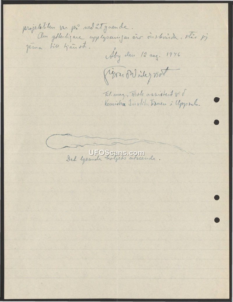 This document is a brief piece of correspondence dated August 12, 1946, written by an individual identified as a Master of Philosophy and First Assistant at the Chemical Institute in Uppsala, Sweden. The author references a projectile sighting, noting that the projectile was moving away. The document includes a hand-drawn sketch depicting the appearance of a luminous casing associated with the object. The author concludes the note by offering to provide further information if it is deemed necessary.