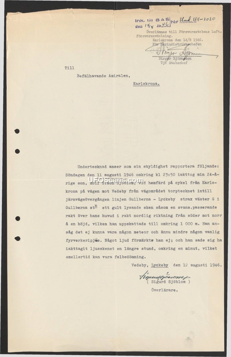Sighting Report of Unidentified Aerial Phenomenon — Vedeby, Sweden, August 1946