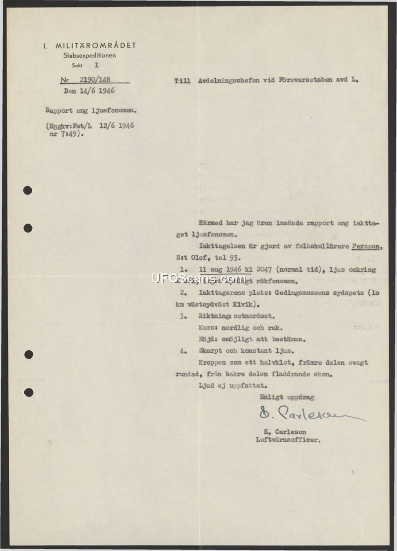 Rapport ang ljusfenomen (Report regarding light phenomenon) — 14 June 1946